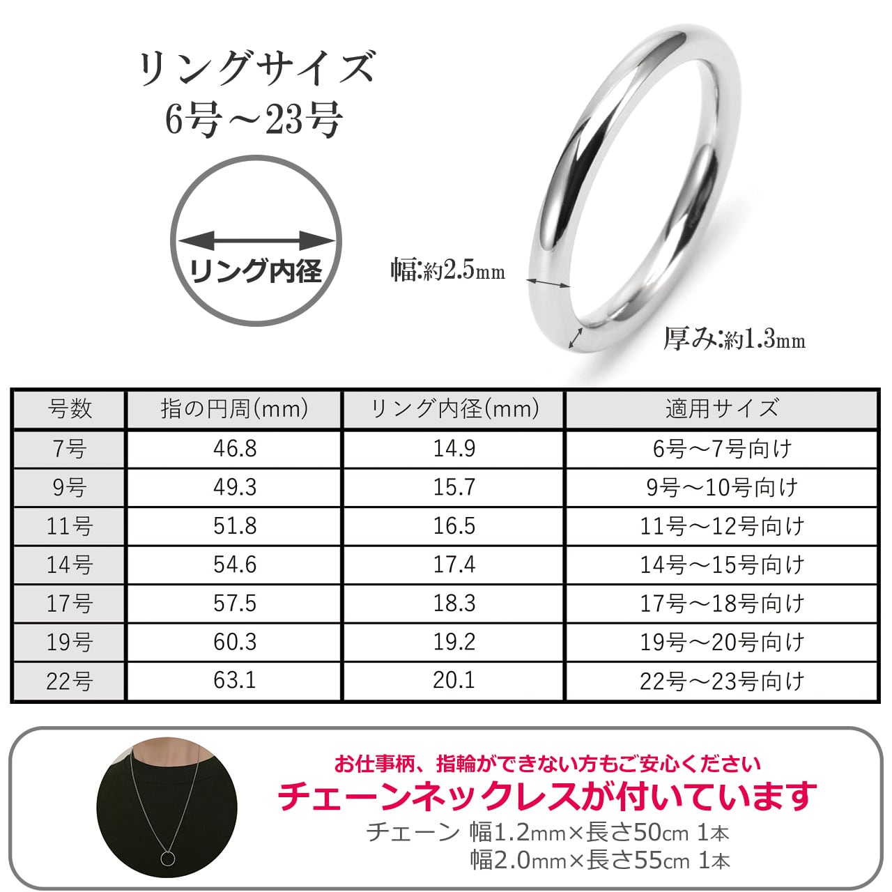 【商品内容】2.5mmリング 2個&50cmチェーン1本 / 55cmチェーン1本、ジュエリーケース1個、ギャランティーカード(品質保証書)1枚、メッセージカード1種類、ギフト紙袋 1袋。ギフトとしてそのままお渡しできる状態でお届け致します。