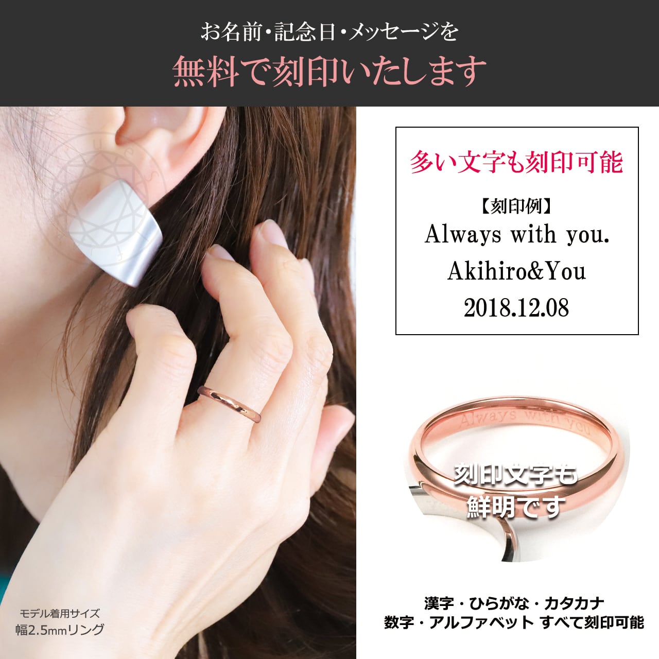 【刻印無料】リングの内側に最長40文字まで無料で刻印致します。多少文字数オーバーしても可能です。商品をカートに入れた後、カート画面でメッセージ欄に「ご希望の刻印内容」をご入力ください。返金・返品・交換は一切お受け致しかねます。ご了承くださいませ。